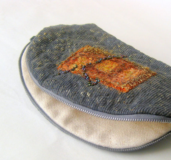 Pouch cosmetic zipper quilted grey beaded applique copper
